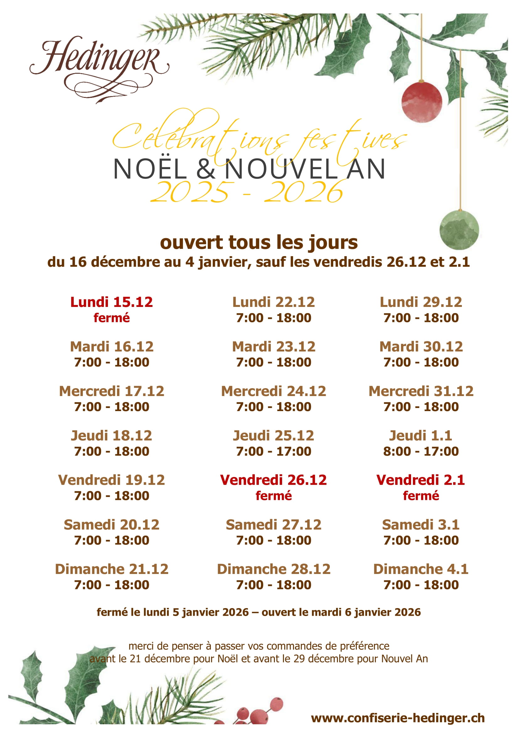 Nous vous remercions de nous faire parvenir vos commandes pour la St-Sylvestre, par téléphone ou directement auprès de nos vendeuses, jusqu'au vendredi 30.12.2022 à 14h00.